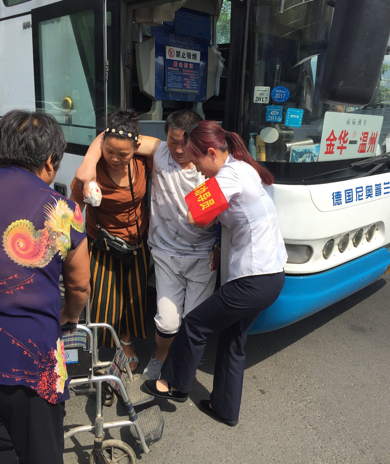 9:35金華到麗水的班車(chē)緩緩地駛進(jìn)了高鐵配載點(diǎn)。車(chē)一停穩(wěn),旅客們便陸陸續(xù)續(xù)的下車(chē)前往下一個(gè)目的地。眼尖的江旭紅看見(jiàn)一位中年婦女在車(chē)門(mén)處很吃力的拉著什么,江旭紅心想,車(chē)上可能有行動(dòng)不便的旅客需要下車(chē)。江旭紅全然不顧烈日的暴曬,毫不猶豫的迎上前去。果不其然,車(chē)門(mén)處的阿姨和車(chē)上的另一個(gè)阿姨正連拉帶抱的幫一位行動(dòng)不便的大叔下車(chē)。大叔看上去50多歲的樣子,因?yàn)榈昧四撤N疾病一點(diǎn)都不會(huì)做自主的動(dòng)作,全憑兩位阿姨慢慢地挪動(dòng),160多斤的體重給兩位阿姨扶他下車(chē)增加了不少的難度。才移下一個(gè)臺(tái)階,汗珠已經(jīng)順著兩位阿姨的臉頰往下淌。江旭紅立即從行李倉(cāng)拿出他們隨車(chē)攜帶的輪椅撐開(kāi),放在車(chē)門(mén)旁。由于車(chē)子臺(tái)階處較窄,站不下其他的人,江旭紅就在車(chē)下位置幫著把大叔的腳抬起來(lái),待大叔被移到最后一級(jí)臺(tái)階時(shí),江旭紅順勢(shì)托起大叔的一只手,和車(chē)上那位阿姨一起,使盡渾身力氣一步一步慢慢地把大叔架到了輪椅上。接著江旭紅又把大叔送到陰涼處,等待家人來(lái)接。這時(shí)的江旭紅已是滿頭大汗,背上的衣服都濕透了。