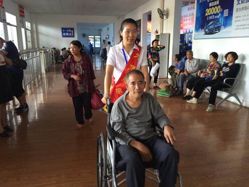 15:55麗水到雙溪口的班車(chē)停在了發(fā)車(chē)位上,鄭淑燕又接過(guò)尤麗娟的接力棒,與班車(chē)駕駛員合力將輪椅上的大哥送上了班車(chē)。