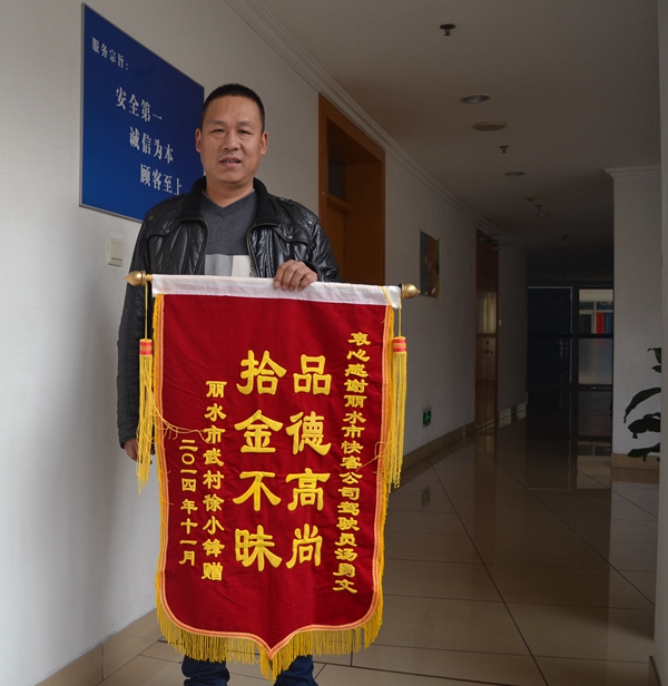 “拾金不昧,本不是新聞了,但輪到自己親身體驗這種社會正能量的日益增長,還是讓我倍感欣喜。”10月16日傍晚,在江蘇開超市的徐先生手拿錦旗,來到快客分公司車隊,對駕駛員湯勇文拾金不昧的精神予以表揚。他說,11月14日他乘坐18:45從杭州回麗水的班車,一時大意把隨身的錢包遺失了,里面有五千多元的現(xiàn)金和若干張銀行卡。次日,當(dāng)他焦急萬分來到快客車隊時,卻發(fā)現(xiàn)駕駛員湯勇文正拿著妥善保管的皮夾等著他?!?br/> 據(jù)了解,當(dāng)天晚上11時左右,駕駛員湯勇文在做下客后的檢查時,發(fā)現(xiàn)一只皮夾被旅客遺落在車廂通道上,他打開皮夾一看,足有好幾千元的現(xiàn)金和各類卡,他心想,這么重要的東西旅客一定會再回來找的,他把情況向值班隊長報告后,又在下客區(qū)足足等了十余分鐘,也不見旅客回來找。于是,他將皮夾保管完好等著歸還旅客,也就有了開頭一幕。